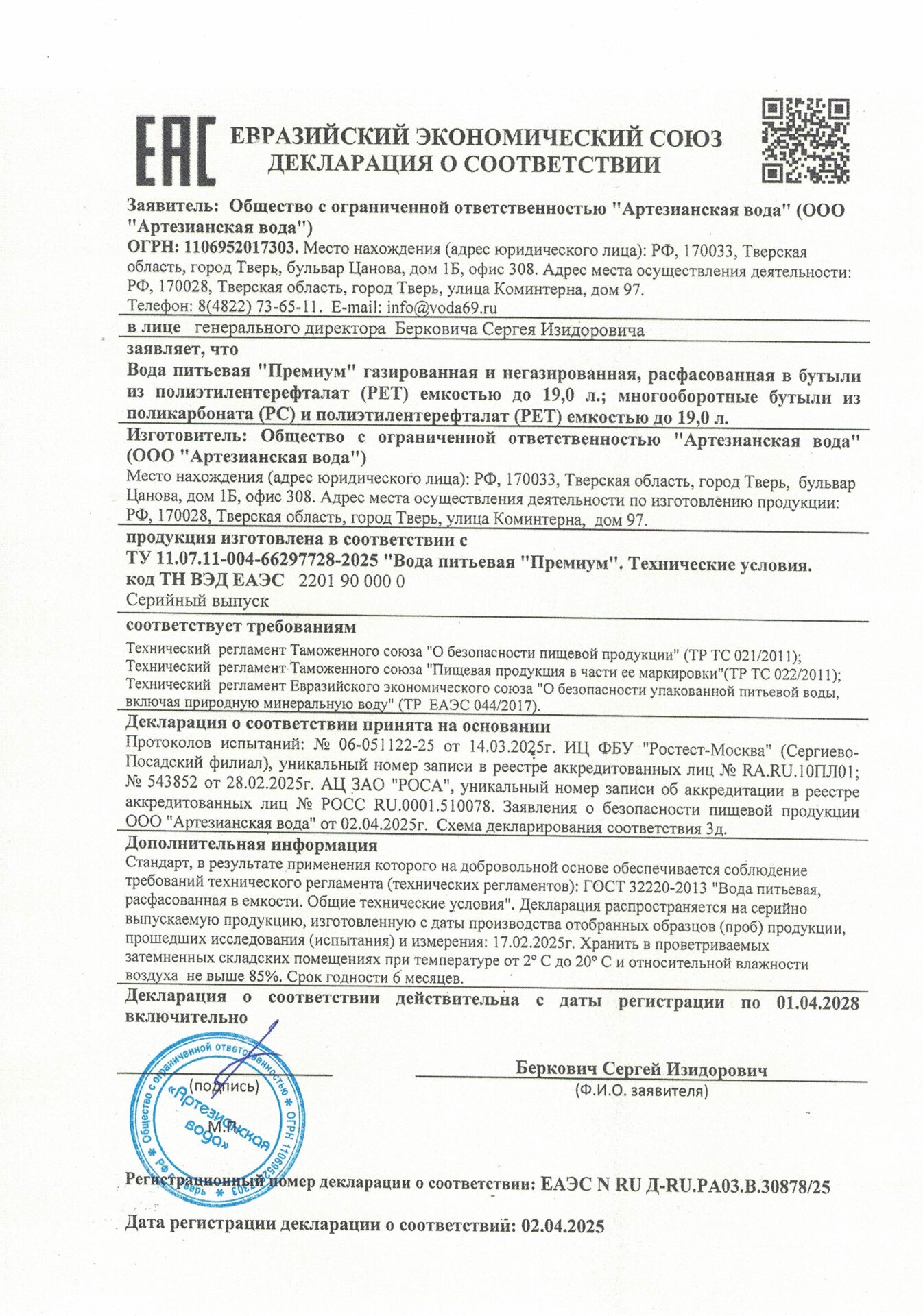 Сейчас ООО “Артезианская вода” - компания осуществляющая полный производственный цикл по производству и доставке воды, начиная от добычи, очистки и розлива питьевой воды и заканчивая оптовыми поставками региональных дилеров.